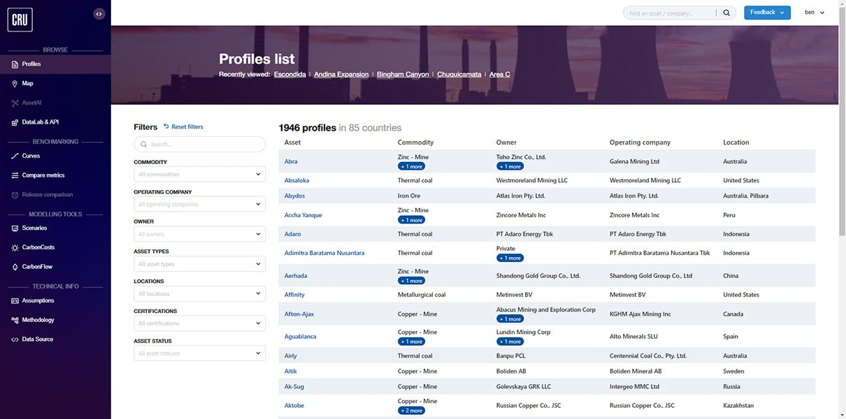 Accessed through the web-based Asset Platform, CRU's Asset Services provide deep insight into the costs, emissions, valuation and overall performance of individual assets and of the industry more generally.