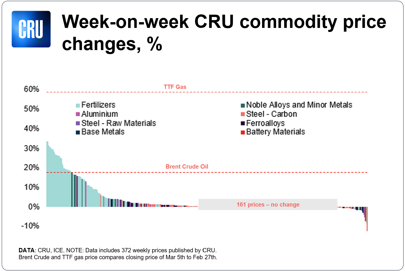 - Aluminium premiums swung 16% higher w/w given Middle East supply disruptions. 161 of CRU’s prices were unchanged this week, reflecting market paralysis as producers, traders and buyers sought to reposition themselves across their respective commodities.