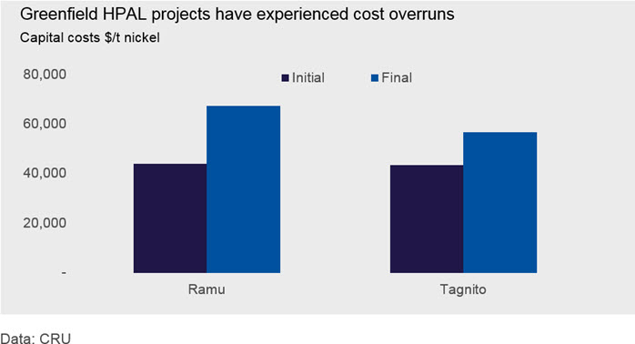 Moreover, the announcement by GEM comes at the same time as the disclosure by Highlands Pacific that Metallurgical Corporation of China (MCC), the majority partner in the Ramu operation in Papua New Guinea is looking to expand the facility at a cost of around $1.5bn. CRU understands the expansion will raise the plant’s nameplate capacity by 34ktpy to 66.6ktpy. The capital cost equates to $44,000/t of nickel.