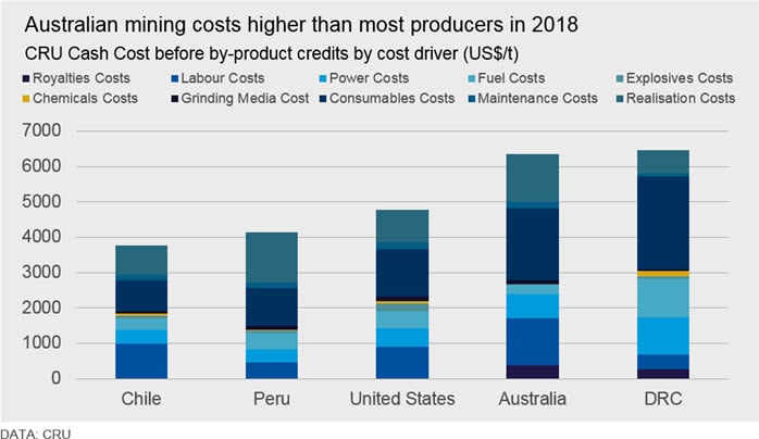 Australia’s average CRU cash costs (including by-product credits) is in line with the global average, due to Australian mines typically benefitting from high by-product credits. This offsets the higher cash conversion costs.Average Australian CRU cash costs (including by-product credits) stand at $2,482/t across all mining operations for 2018, compared to: