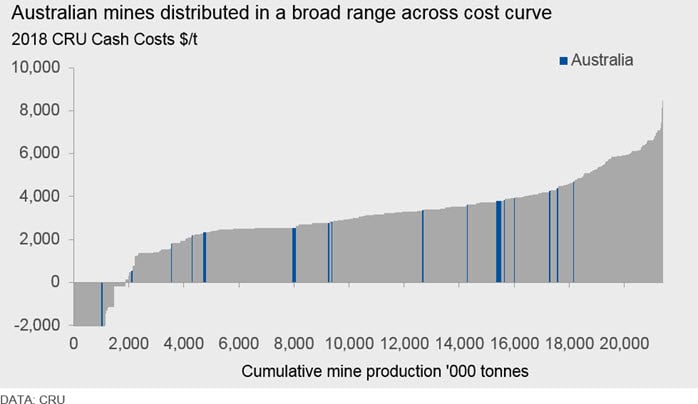 Australian mines are distributed in a broad range throughout the cost curve on a CRU cash cost basis, with a number of operations located in both the first and fourth quartiles of the cost curve.