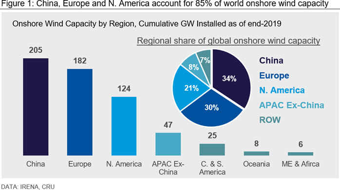 On a regional basis, China is unquestionably the leader in onshore wind deployment, growing from barely 17.6 GW in 2009 to 204.5 GW last year, a 27.8% CAGR, and now accounts for nearly one-third of global installed capacity (see Figure 1). However, capacity growth slowed to 13.6% y/y in 2019, as the government began phasing out feed-in tariffs (FITs). China’s northern provinces such as Qinghai, Xinjiang and Inner Mongolia have the greatest onshore wind potential, yet the inadequate grid infrastructure to connect these renewable resource-rich sites to population-centric areas in the east and south remain a key constraint.