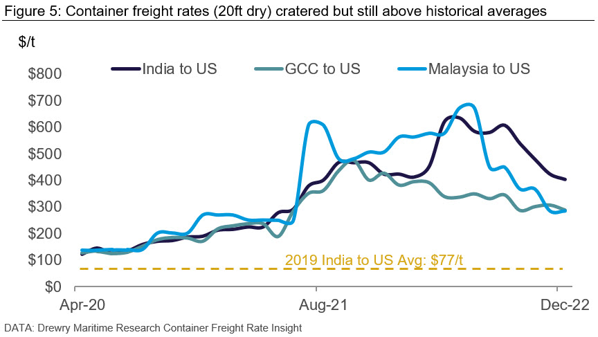 Freight remains above historical averages: Ocean freight and inland trucking rates both fell in mid-2022. Despite the drastic drop, both continue to sit above historical averages.