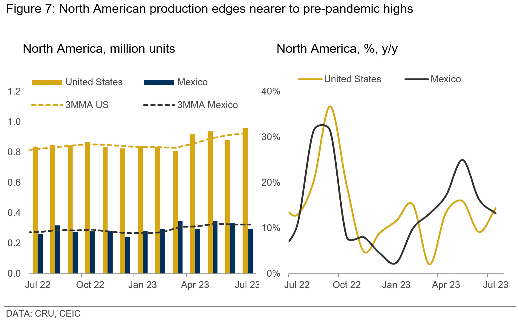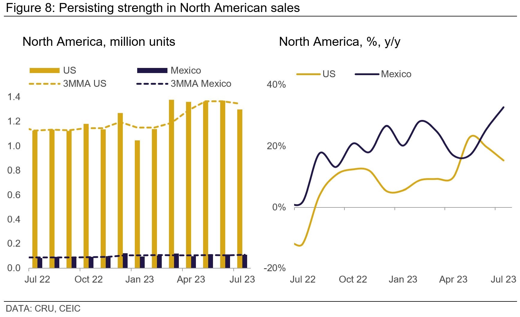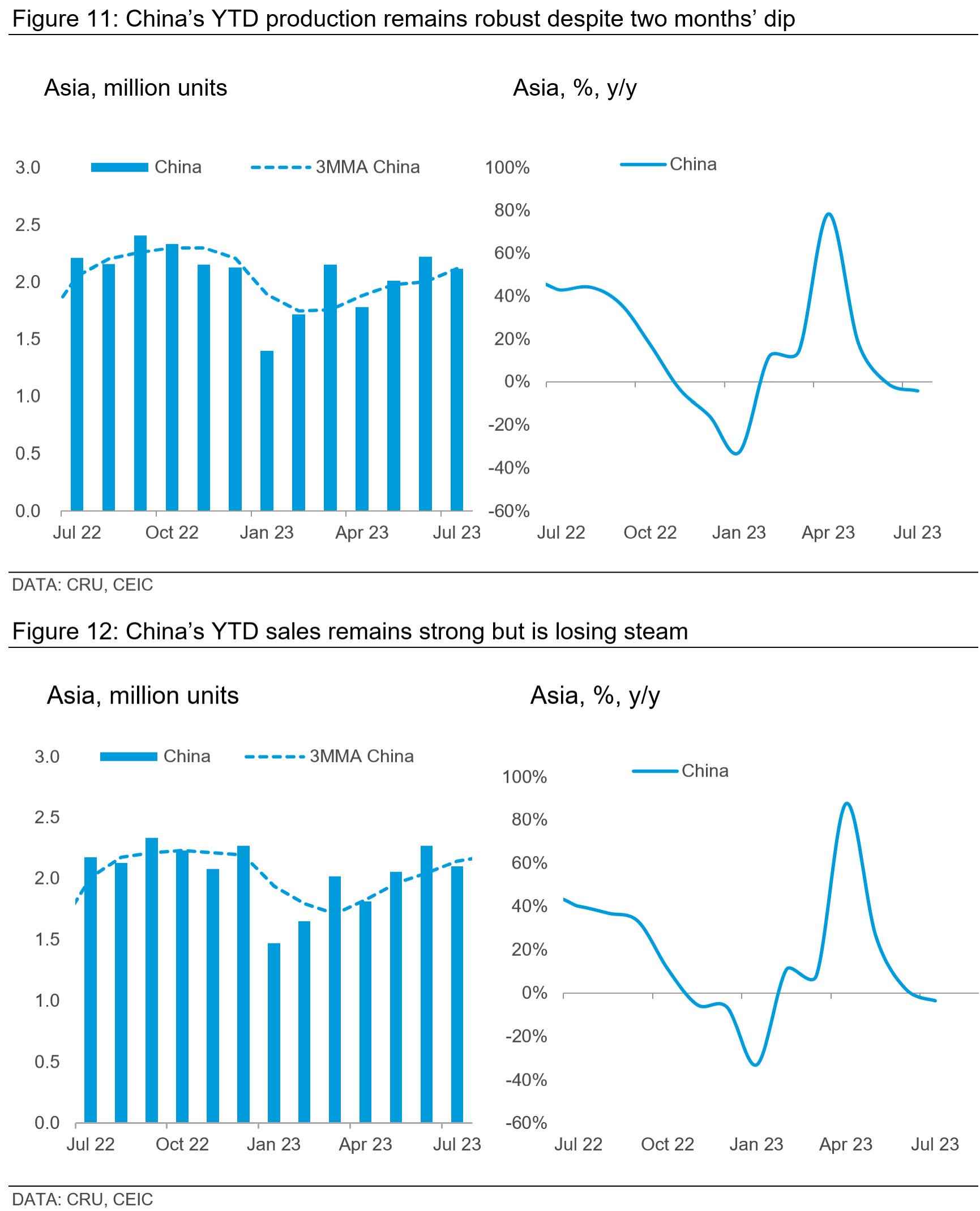 In contrast to the uncertainties clouding the European market, North America, especially the US and Mexico, showed continued resilience in July. US light vehicle (LV) production surpassed its three-month moving average (3MMA). While Mexico dipped below its 3MMA, year-on-year statistics still underscore a favourable growth trend. Both markets exhibited a double-digit year-on-year growth.