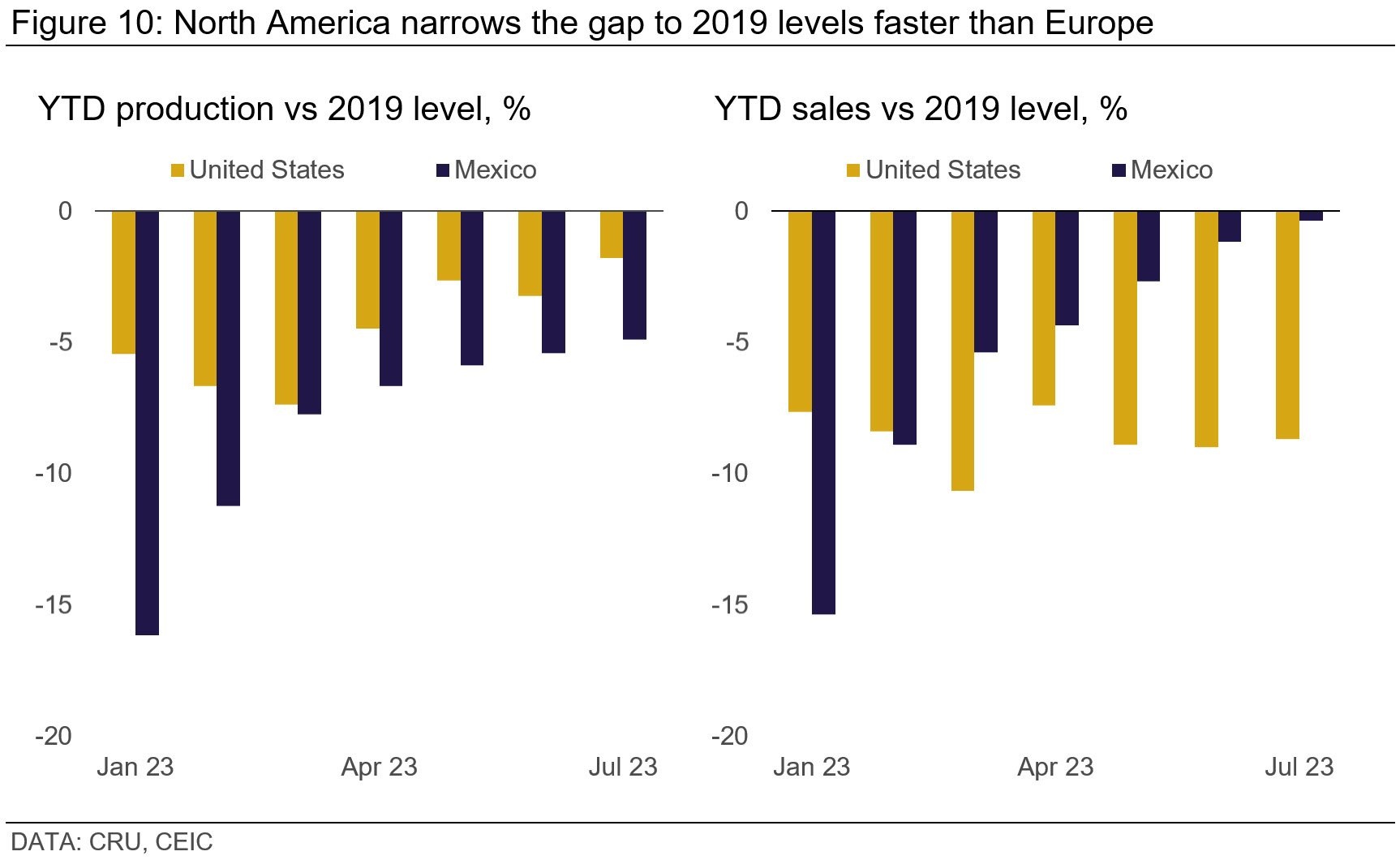 In year-to-date comparisons, the US has ramped up its LV production by approximately 12% from last year, while Mexico boasts an increase of roughly 14%. While these gains are commendable, production levels have yet to match those seen in 2019. The US is just 1.8% shy of its 2019 levels, whereas Mexico lags by 4.9%. Nevertheless, North America's resilience sets it ahead of its European counterparts.