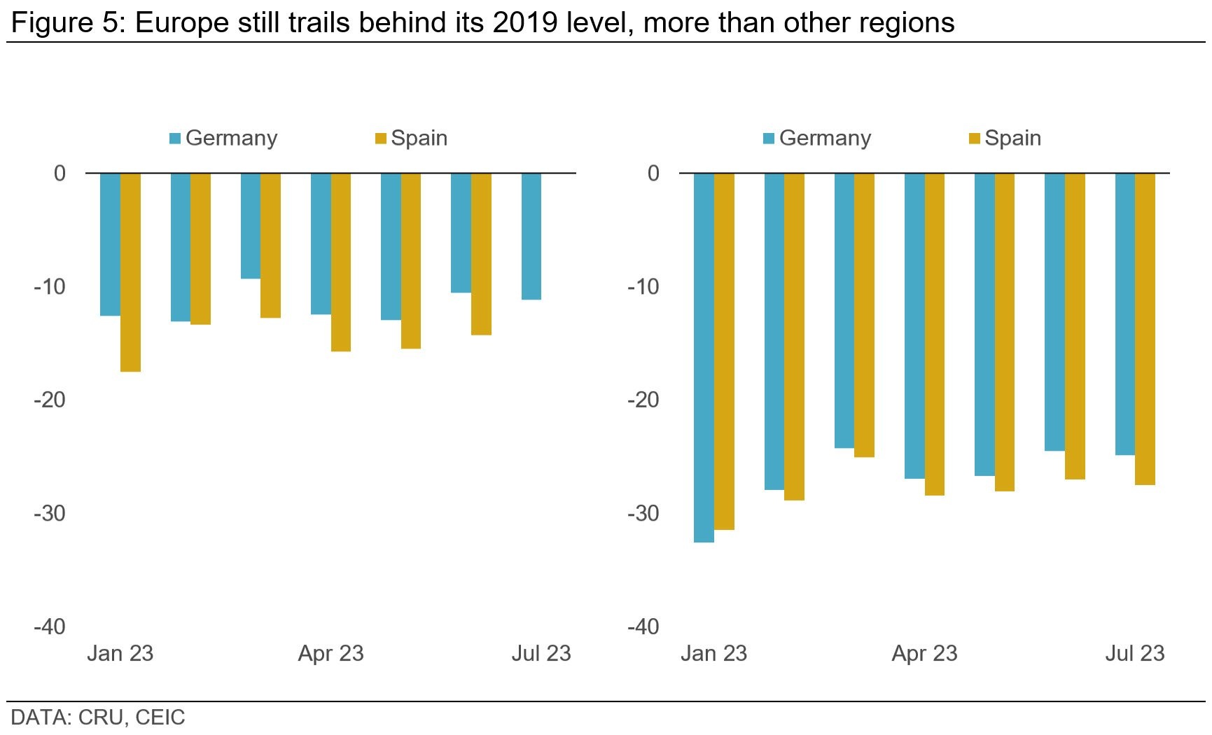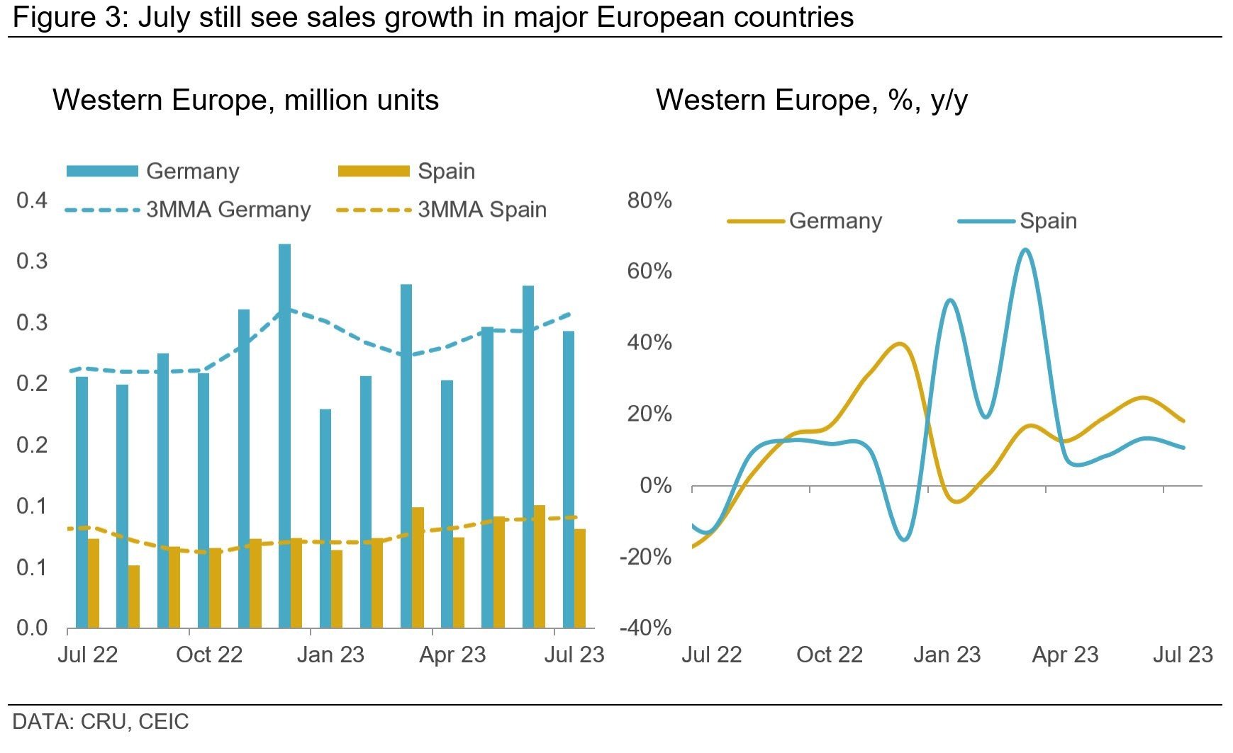 Registration data across major European markets in July were upbeat. Germany's new car registrations increased by 18% y/y, France by 19.9% y/y, Spain by 10.7% y/y, and Italy by 8.7% y/y. But this silver lining has a cloud; compared to pre-crisis 2019 levels, YTD new registrations across major markets are on average down by over 25%.