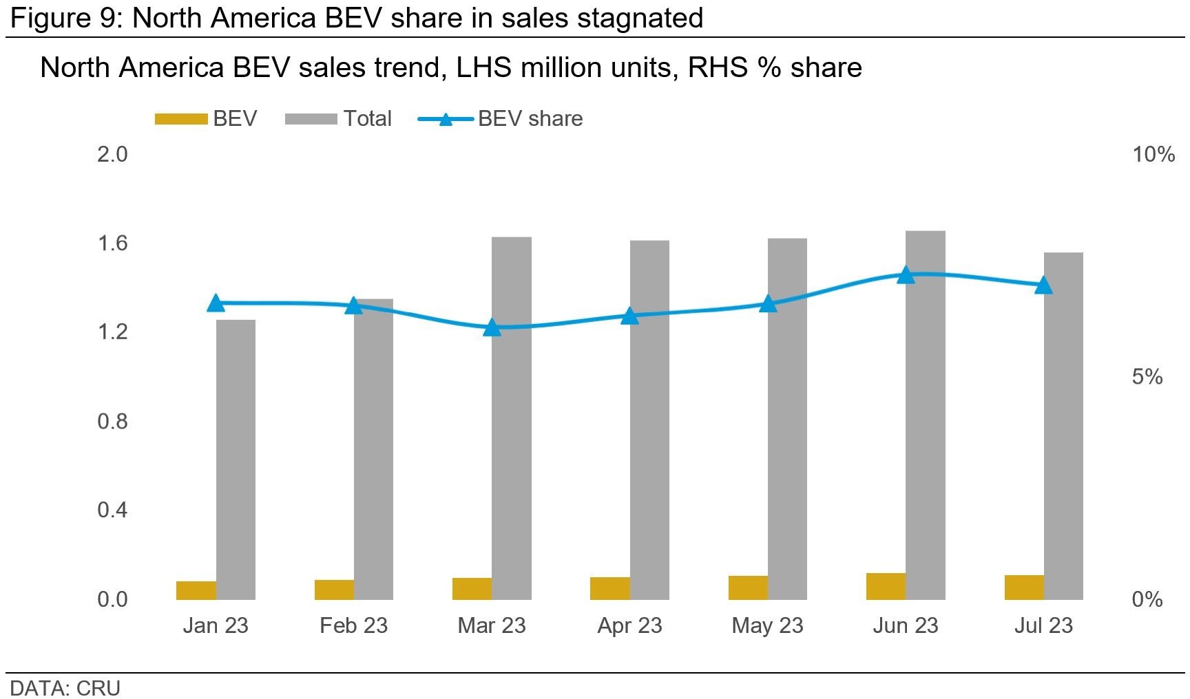 On the electric front, EV prices are dipping, led primarily by Tesla. July's EV ATP was $53,469, a decrease from both June and January. Even as manufacturers like Ford are joining the price-slashing bandwagon initiated by Tesla, profitability remains a concern for most, thanks to high BEV production costs and narrow margins. Given these factors, traditional Internal Combustion Engine (ICE) or hybrids may remain attractive for consumers. North America's EV market share seems to be going nowhere fast, holding at 7% in July – a figure that lags behind Europe and China.
