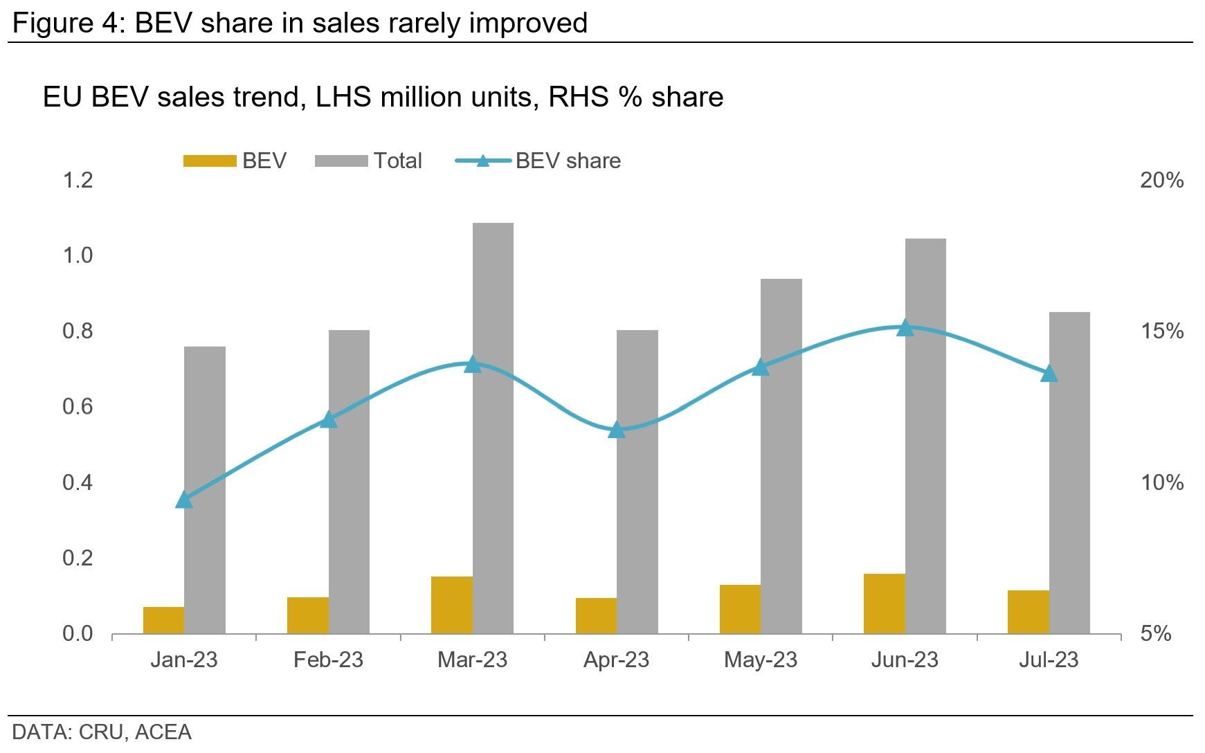 BEV registrations in July for the EU have been encouraging. A substantial 60.6% y/y increase brought the figure to 116 K units, which now accounts for 13.6% of the market. Several EU countries reported significant growth rates, with registrations in Belgium soaring by 236% y/y, Germany by 69%, and France by 32%. Yet, while YTD BEV sales in the EU have risen nearly 55% y/y, market share has not progressed decisively. Notably, major markets have observed BEV sales stagnate or even decline recently.