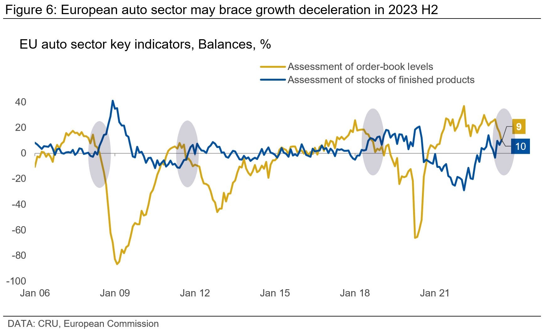 Several concerning signals emerged from the EU auto sector in July. Order book levels witnessed a sharp downturn, marking the fourth consecutive month of decline and hitting the lowest point since Mar 2021. Inventory levels swelled, reaching the second highest peak last observed in Jul 2020. Similarly, confidence indicators plummeted to the lowest level since July 2020. This is the fourth time that a falling order book index together with surging inventory levels since 2006; each previous instance correlated with significant market downturns.