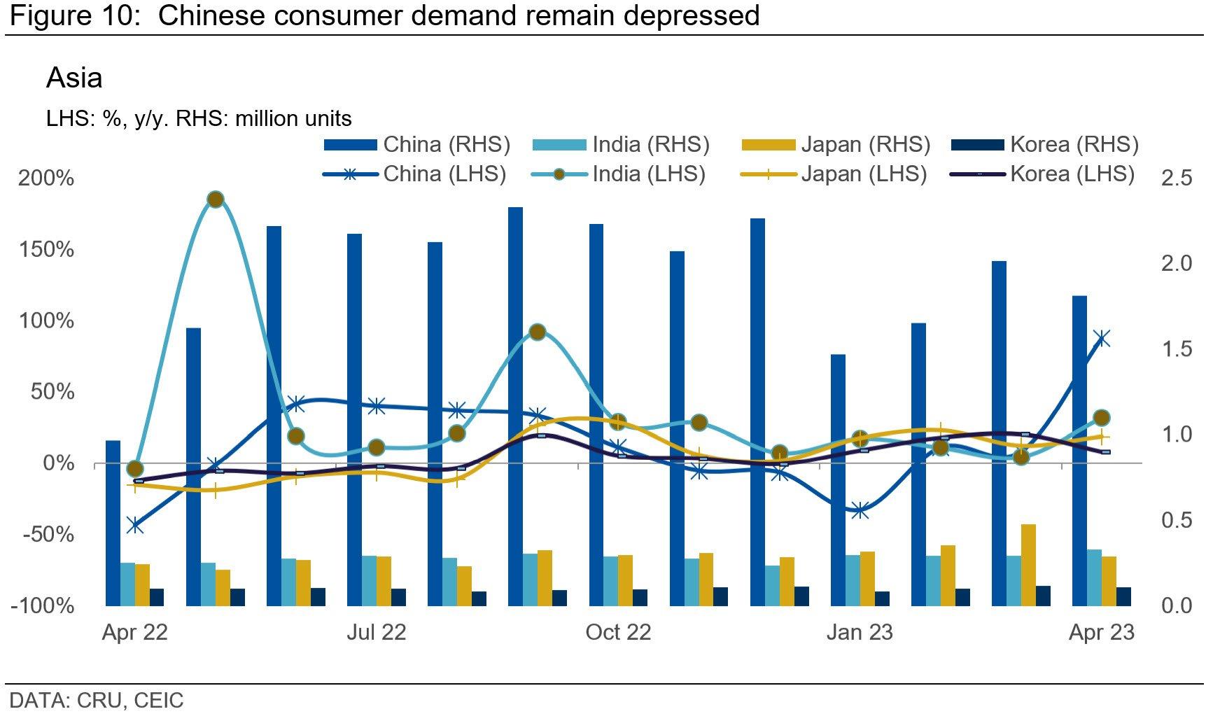 Asia's key automotive markets experienced noteworthy y/y sales growth in April. Dominant players like China, India, and Japan reported double-digit y/y increases. However, China's robust 88% y/y rise can largely be attributed to last year's low baseline due to the Shanghai lockdown. M/m sales declined by 10%, suggesting a persisting weak demand.