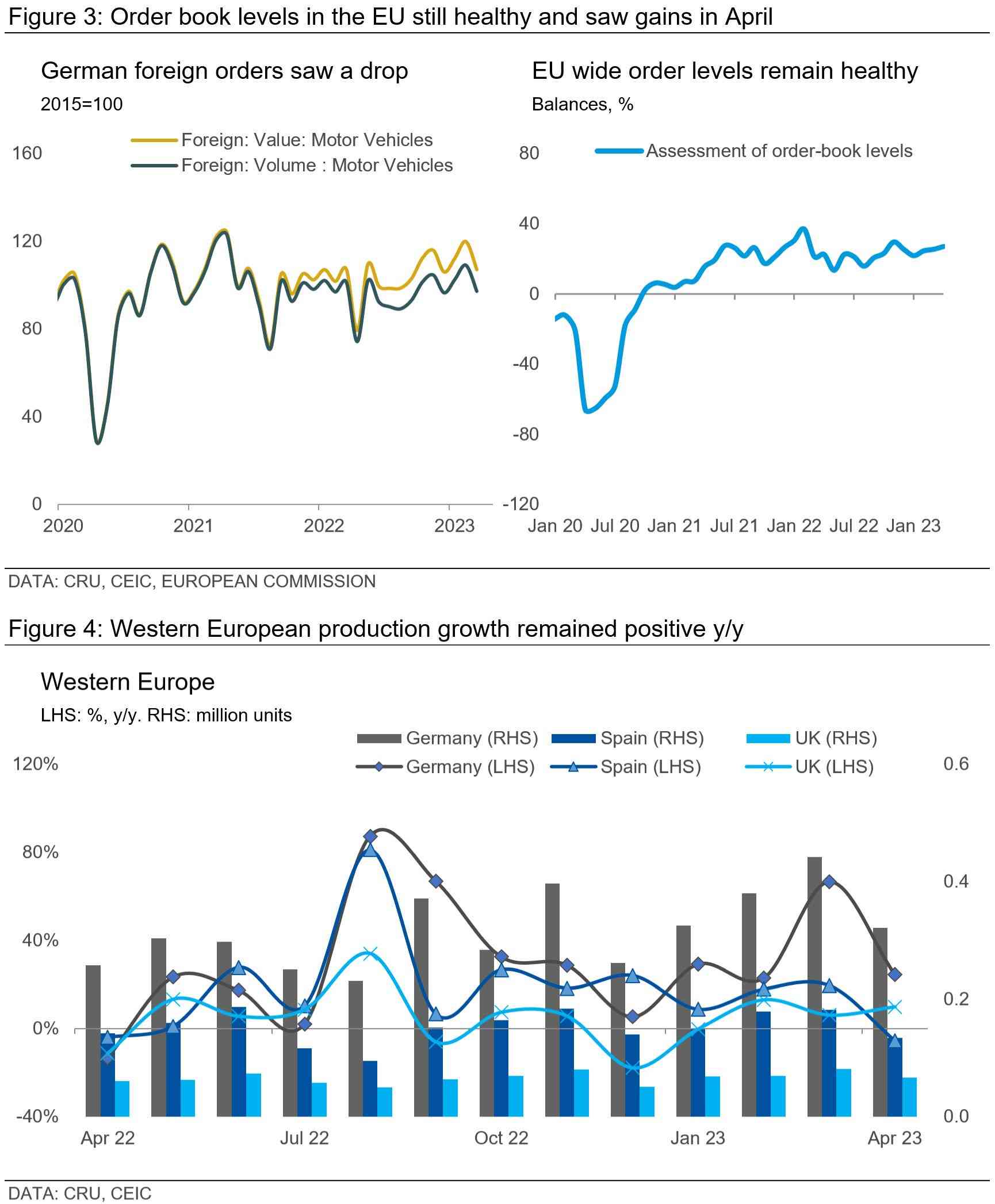 Despite this positive trajectory, German motor vehicle foreign orders dipped in March, hinting at a potential demand slowdown. Still, EU-wide order books held firm, even achieving a slight uptick in April. Momentum in actual sales, which has been building since the start of the year, continued strongly into April across most European markets. April saw a substantial rise in passenger car registrations in the EU, with a year-on-year increase of 17%, equating to just over 803 K units sold. For the first four months, the EU car market expanded by nearly 18% y/y, with 3.5 M cars sold.