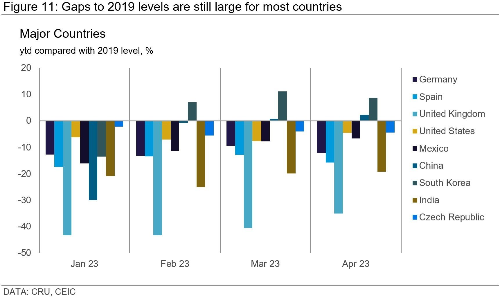 Both the US and Mexico experienced double-digit year-on-year growth in light-vehicle production in April. The US produced over 922 K units, marking the highest production level since Jul 2020, an encouraging sign of recovery. Mexican production has also shown consistent growth, rising for the eleventh consecutive month. Both countries are steadily narrowing the gap to their 2019 production levels. The US YTD production is now only 4.6% below its 2019 level. Mexico is currently 7% below the 2019 level.