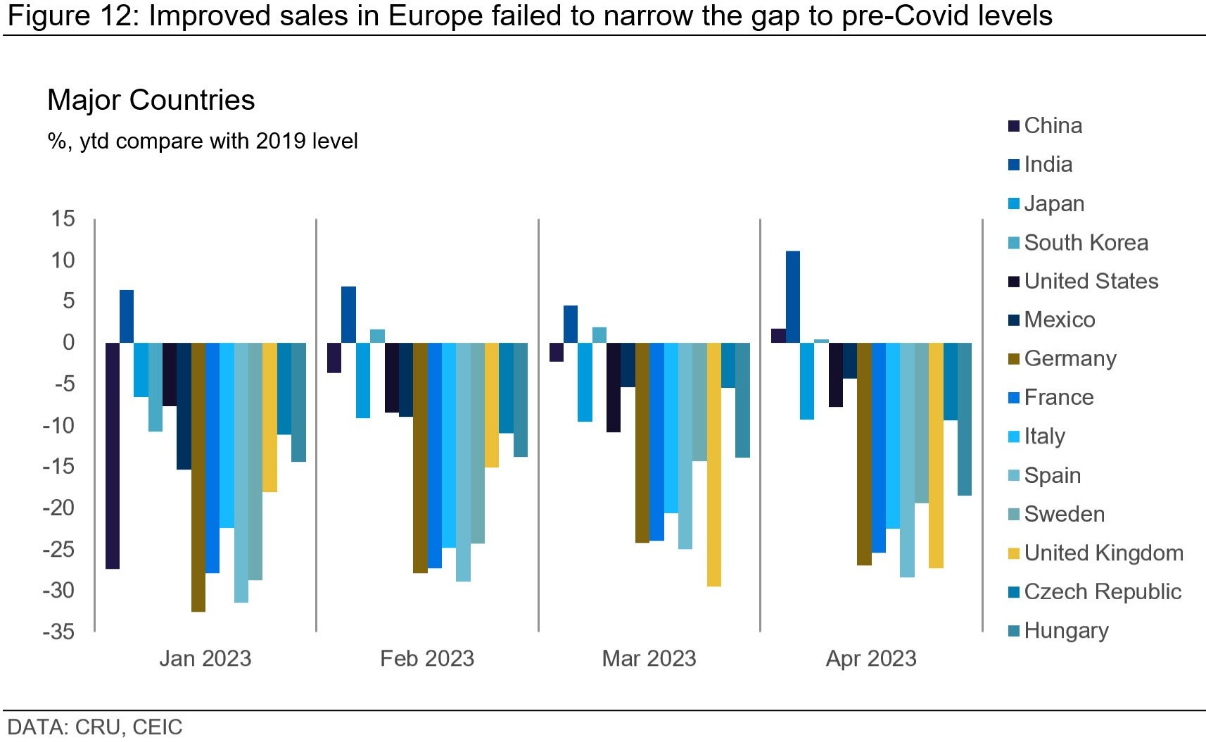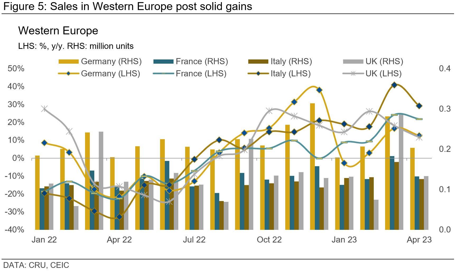 Each of the major markets posted robust gains. Spain led the way with the highest growth rate of 34% y/y, followed by Italy at 29%, France at 22%, Germany at 13%, and the UK at 12%. However, we must consider these y/y gains in light of a very weak April 2022. Despite this robust year-on-year growth, the distance to 2019 sales levels remains considerable, with overall sales lagging more than 20% behind, particularly in Western European markets.