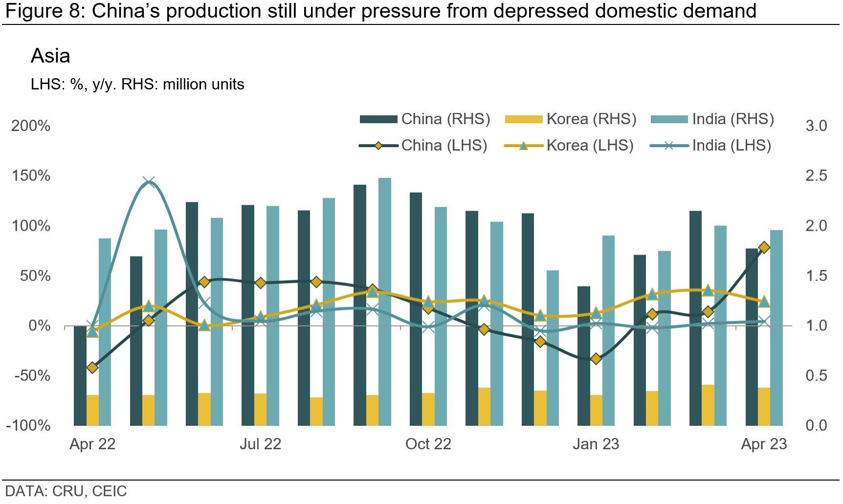 In Asia, April saw robust production growth across all major countries. However, the context varies. China, for instance, experienced a substantial year-on-year production growth of 79%. This surge can be attributed largely to the low base effect due to the Shanghai lockdowns last year. A 17% m/m decline actually indicates persistent weak demand, exacerbated by an ongoing price war and uncertainty over policy that has left consumers hesitant to commit. Despite the price drops, an uptick in deliveries has not materialised, presenting a significant challenge for OEMs. We previously anticipated the price war to be transient, and maintain the expectation for market normalisation by July when this price competition is likely to recede.
