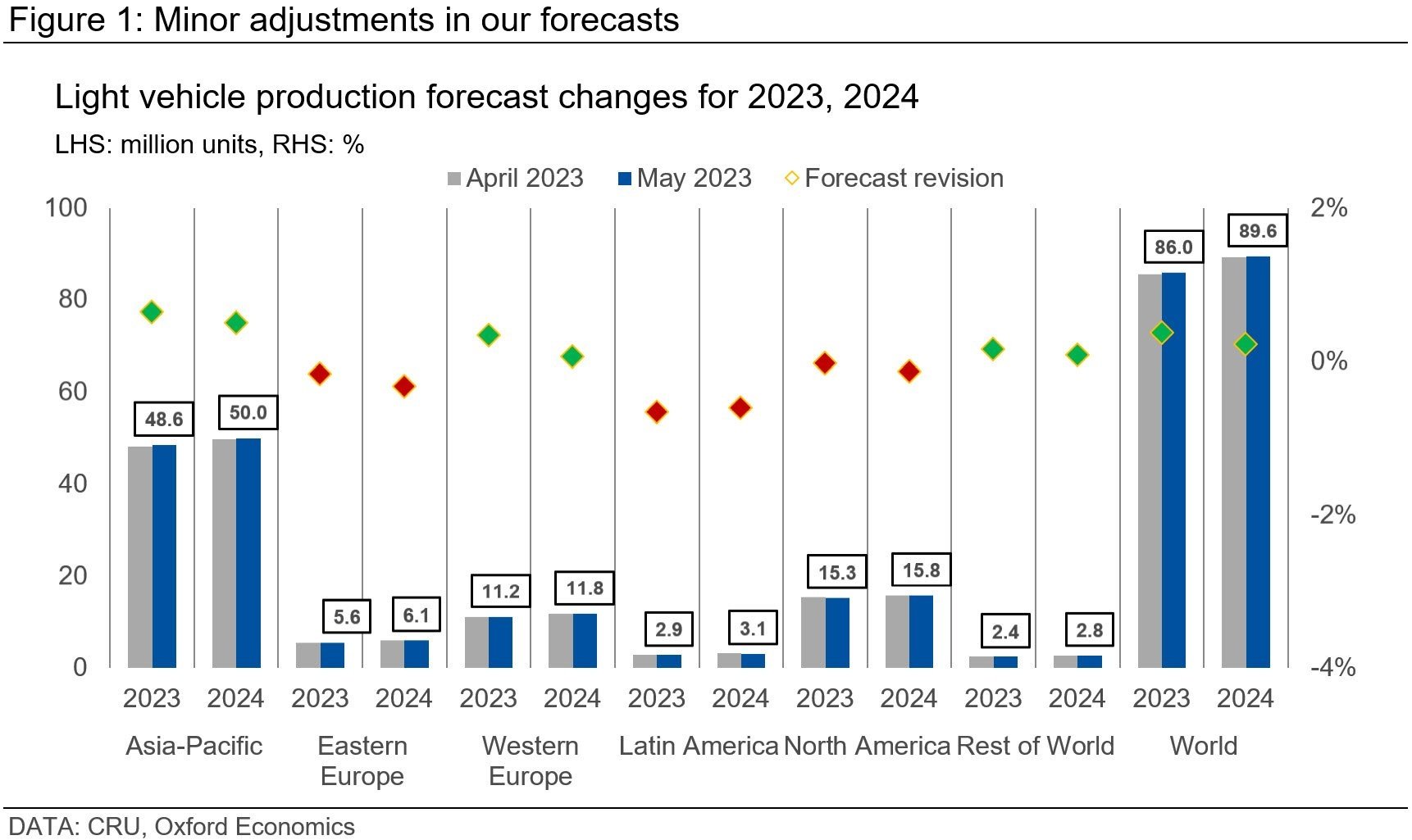 We have revised up our forecasts for World light vehicle production to 86 M vehicles in 2023 (85.6 M previously) with 4.8% y/y growth (4.4% previously), and to 89.6 M in 2024 (89.4 M previously) with 4.2% y/y growth (4.4% previously). Figure 1 summarises the key changes in our latest forecasts, and Figure 2 shows our view for major regions out to 2027.