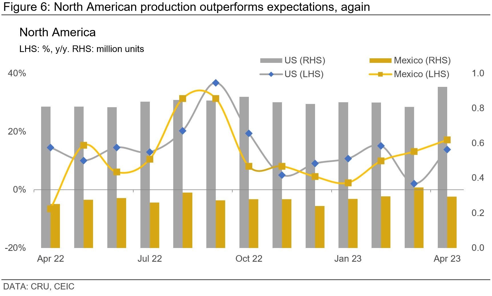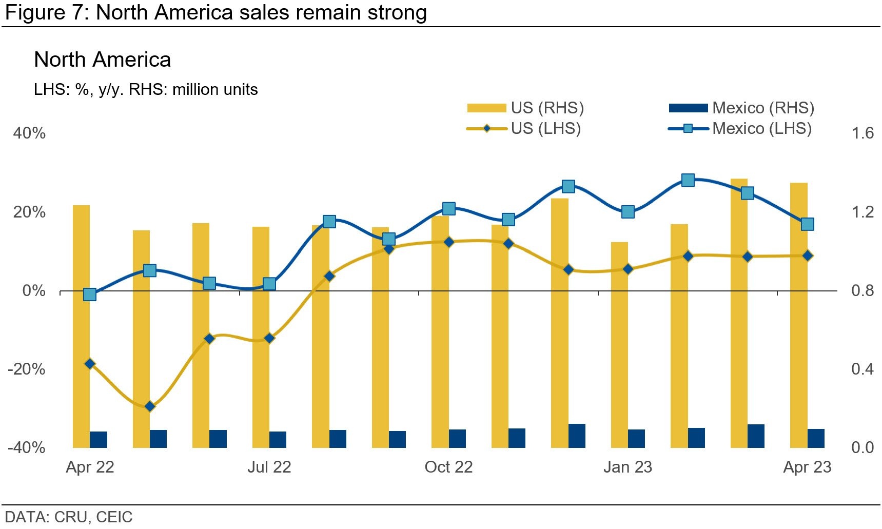 YTD data for the first four months reveals an 8% y/y growth in US LV sales, while Mexico demonstrated a nearly 23% y/y rise. Comparatively, sales are improving in both countries against the 2019 period, with the US 7.8% below and Mexico 4% below the 2019 level.