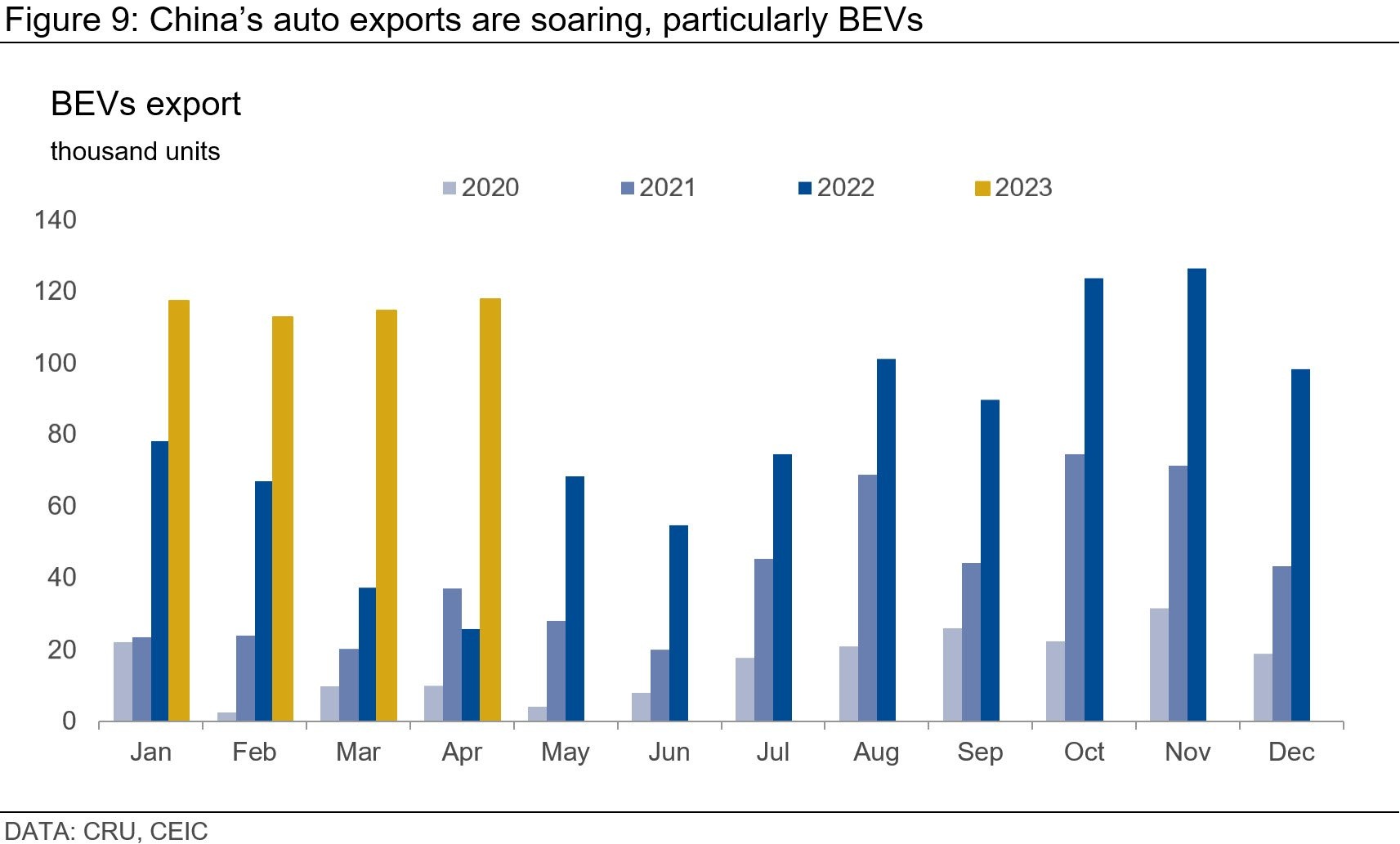 Chinese auto exports continue to demonstrate strength. In the first four months, passenger car exports experienced an impressive 86% y/y growth. Notably, Battery Electric Vehicles (BEVs) retained a significant share of exports in April at 33%, despite a decline from February's all-time high of 42%. Year-to-date, BEVs exports have soared by 122% y/y. This robust export performance is supporting auto production within China, partly offsetting weak domestic demand.