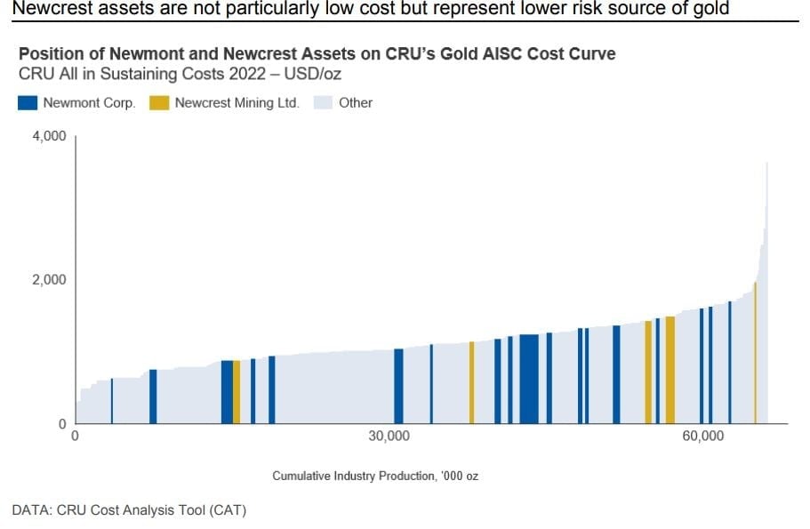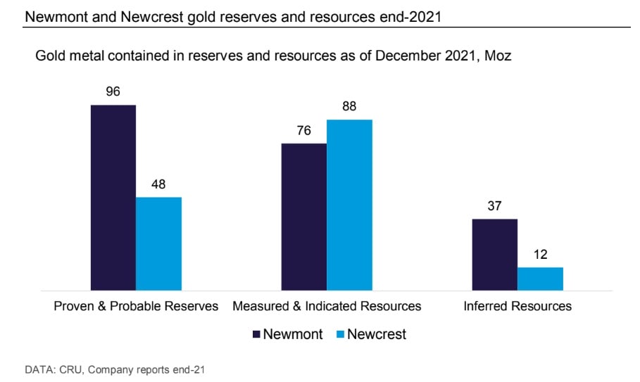 On top of this, Newcrest’s gold tenements and reserves would increase Newmont’s operational Proven & Probable gold Reserves by 50% to 144 Moz, based on 2022 Reserves and Resources statements. Meanwhile, the enlarged gold miner would see its Measured, Indicated and Inferred gold Resources almost double from 113 Moz to a total of 213 Moz. Newmont will also be interested in Newcrest’s Measured and Indicated copper Resources rising from 19 Mt at the end of 2021 to 25 Mt reported in August 2022.