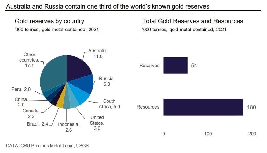 Gold reserves and resources are globally spread with the top four countries with the largest known gold reserves including Australia, Russia, South Africa and the USA. Geopolitical issues complicate or bar investment in Russian gold production while continued power availability and political issues continue to hinder South African gold resource development. Large Australian gold reserves, therefore, are a relatively safe investment for a gold mining company looking to secure its project pipeline and future gold production.