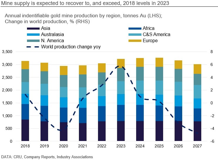 CRU forecasts identifiable gold mine production to reach 3,045 t in 2023, a 2.85% y-o-y production increase from 2022. This is due to combined increases in output from Latin America, Australia, Russia, and Africa, offsetting declines from Asia. CRU expects mine production to grow for three more years, rising to a peak of peak 3,261 t in 2025, before falling back as growth in North America and Australia gives way to contraction, while the downtrend in African production accelerates.