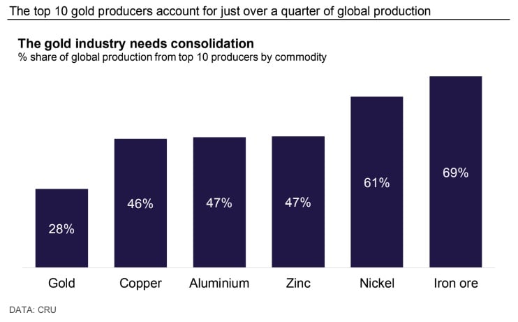 In all scenarios CRU expects asset sales as non-core assets are removed. This will create opportunities for other miners to add to their gold portfolios. More importantly investors will look for evidence that the gold sector can optimise operational costs, deliver sustainable margins, and increase shareholder value through consolidation. If this were proven, expect further pressure to consolidate in the gold sector.