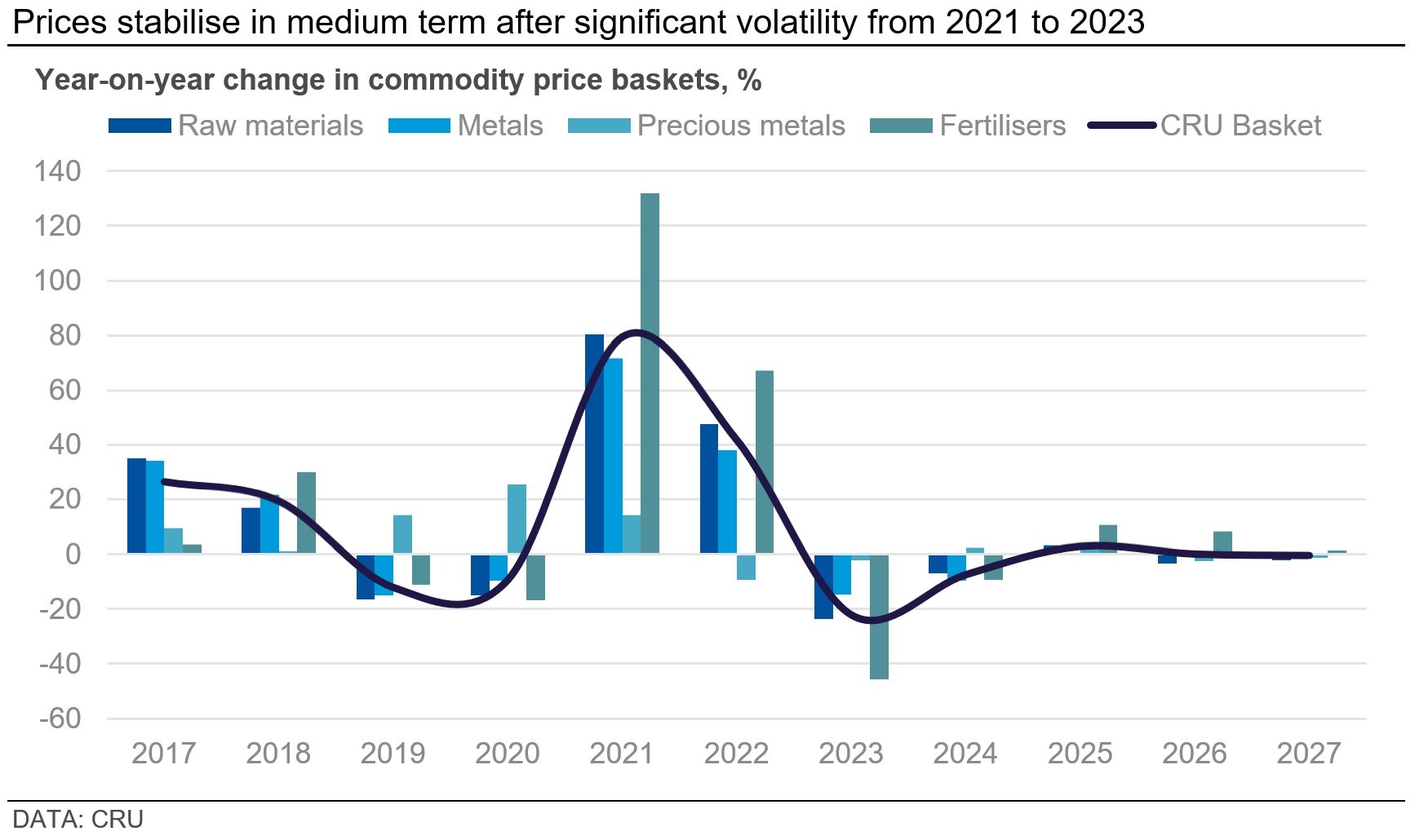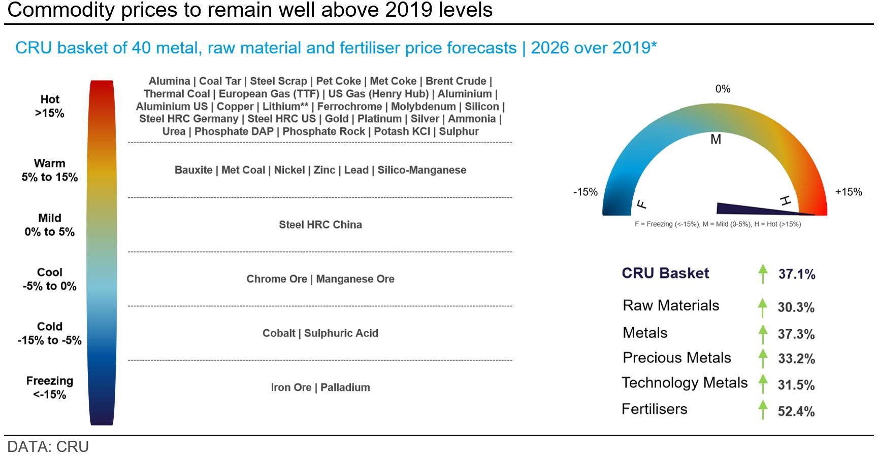 The year-on-year price changes do not, however, show the impact of inflation on commodity prices in dollar terms. CRU expects prices to settle from 2024 at a higher level than seen pre-pandemic. The CRU commodity price basket is expected to be 37.1% higher in 2026 when compared to 2019, driven by price increases of over 30% in all commodity areas.