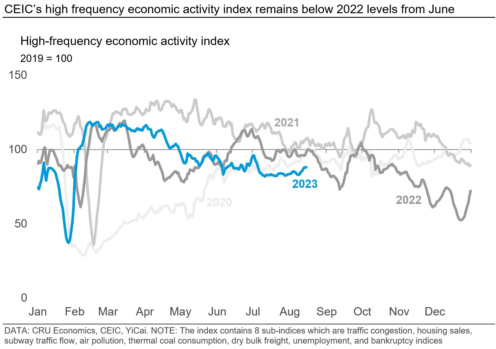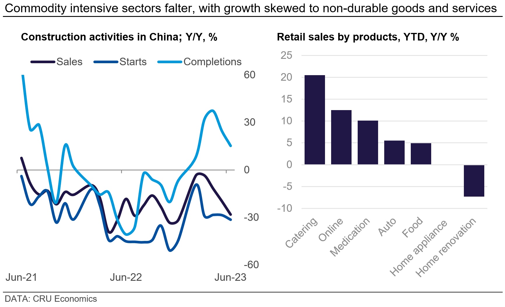 CRU believes the economic outlook in China remains weak for 2023 H2 due primarily to the lack of household-focused fiscal support. While the west tackles record inflation Chinese consumer price inflation (CPI) slipped into deflationary territory in July, a sign of weak consumer demand and risk aversion further evidenced by growing household savings. Several supportive policy measures have been announced. However, their effectiveness will be limited in 2023 H2 and 2024 by limited private sector confidence.