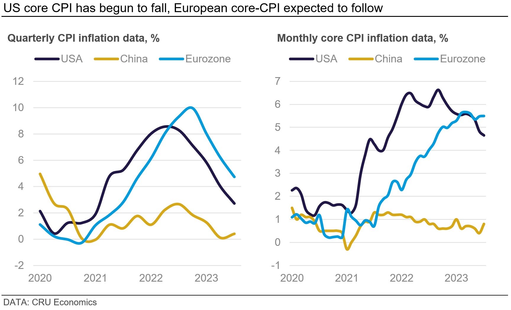 CRU believes the US Fed made its last rate hike of this cycle in July. However, high interest rates will not be disappearing any time soon. The outlook for inflation rates and interest rate hikes also faces significant risks such as a wage/price inflation spiral or another severe energy crunch in Europe this winter.