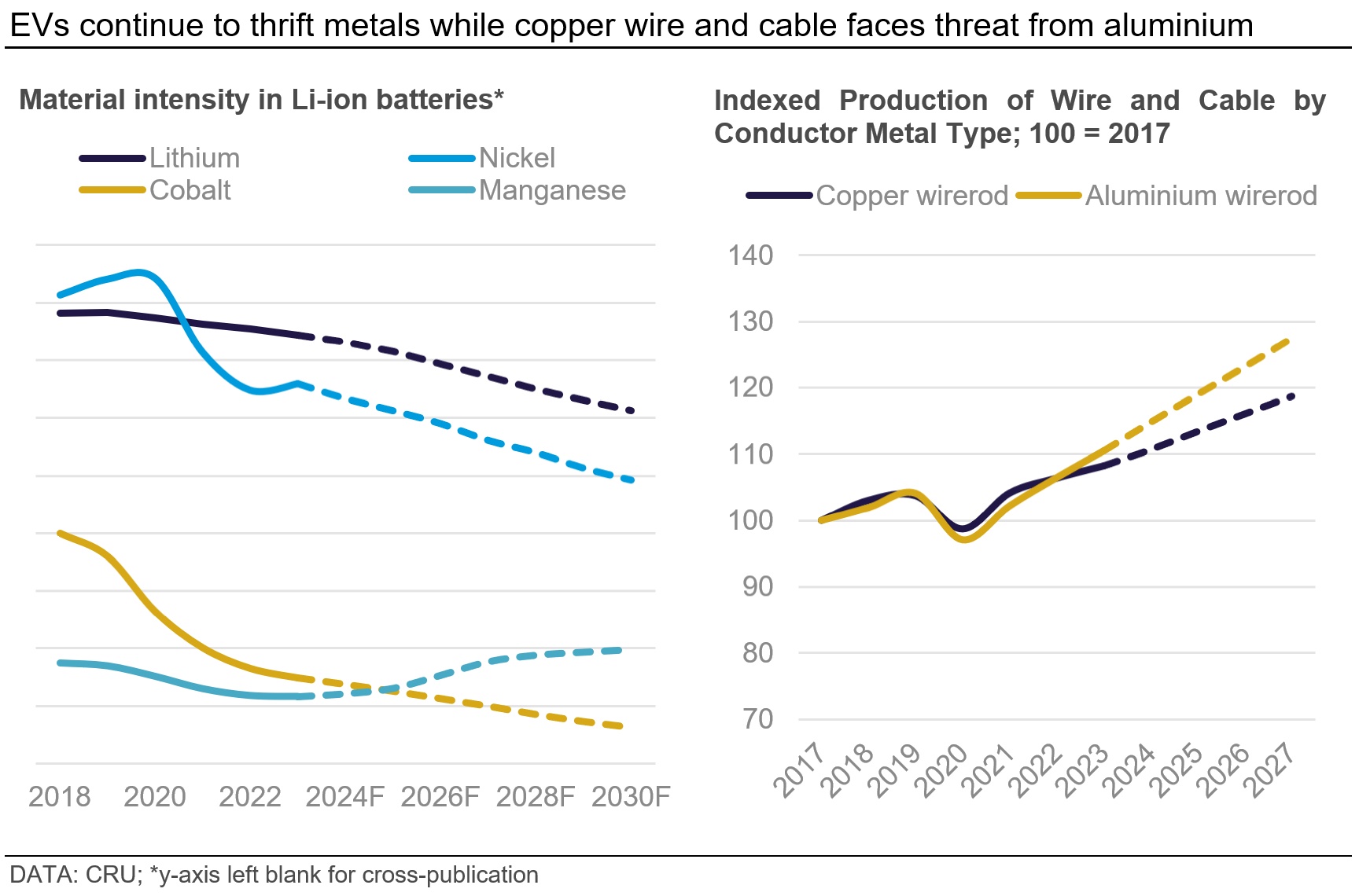 Finally, many metals face the longer-term threat of thrifting and substitution. Rapidly developing battery technologies have seen the rise of lithium iron phosphate (LFP) and nickel rich NMC 811 battery types. CRU expects this push towards high performance and lower cost battery types will reduce lithium required per kWh by nearly 15% by the end of the decade compared to 2022, softening expected demand for lithium. Meanwhile, production of aluminium wire and cable is forecast to accelerate as markets continue to price in high future copper prices due to poor mine supply pipelines.