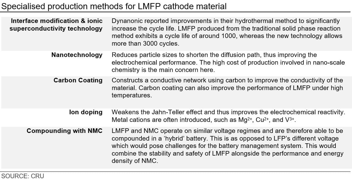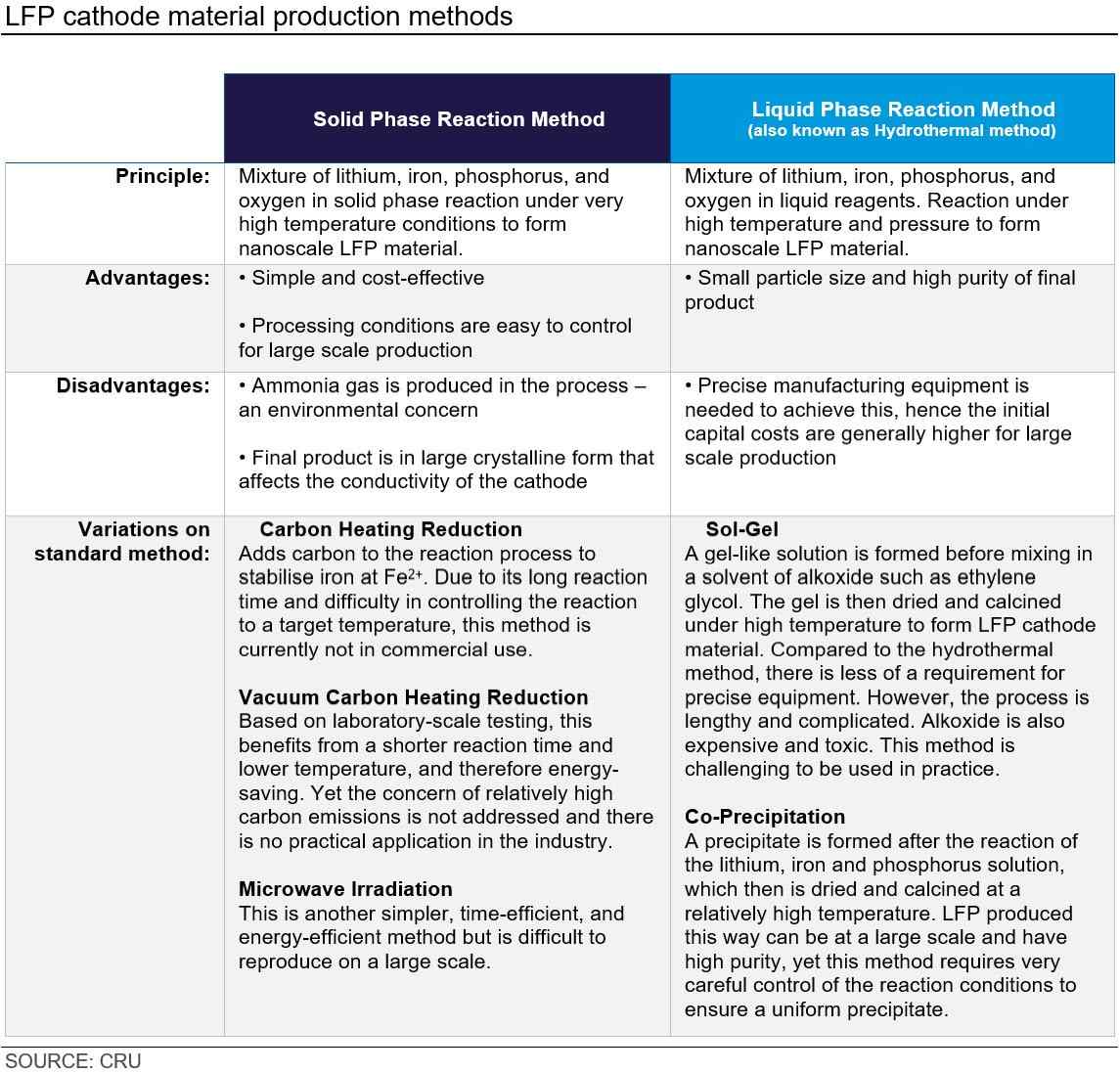 As manganese and iron require atomic-level mixing, CRU initially expected that the high granularity and purity enabled by the Hydrothermal Method is likely to be more favoured in the production of LMFP. However, early evidence shows that most companies are adapting the solid phase route that they use for LFP.
