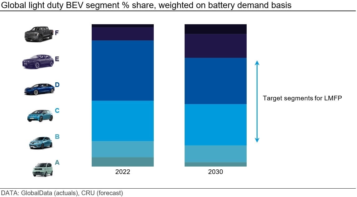 The main application for LMFP will be in EVs. Despite the major technical improvements in LFP demonstrated over the past couple of years, many automakers continue to bemoan its limitations in energy density and remain hesitant to use it in larger EV segments that require longer ranges. LMFP offers 10-20% higher energy density as exhibited by the increase in operating voltage from 3.2 V, up to 3.9 V. Because of this, LMFP is expected to primarily cater for mid-size vehicles, which constitute the largest demand segment as OEMs overwhelmingly target them in their corporate strategies.