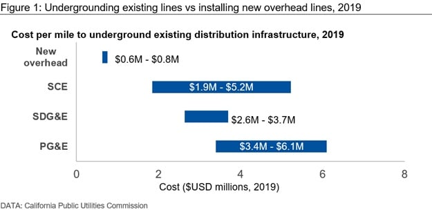 In 2019, several investor-owned utilities reported to the California Public Utilities Commission (CPUC) the cost range for undergrounding their existing overhead distribution lines. The utilities included Southern California Edison (SCE), San Diego Gas & Electric (SDG&E) and Pacific Gas & Electric (PG&E).