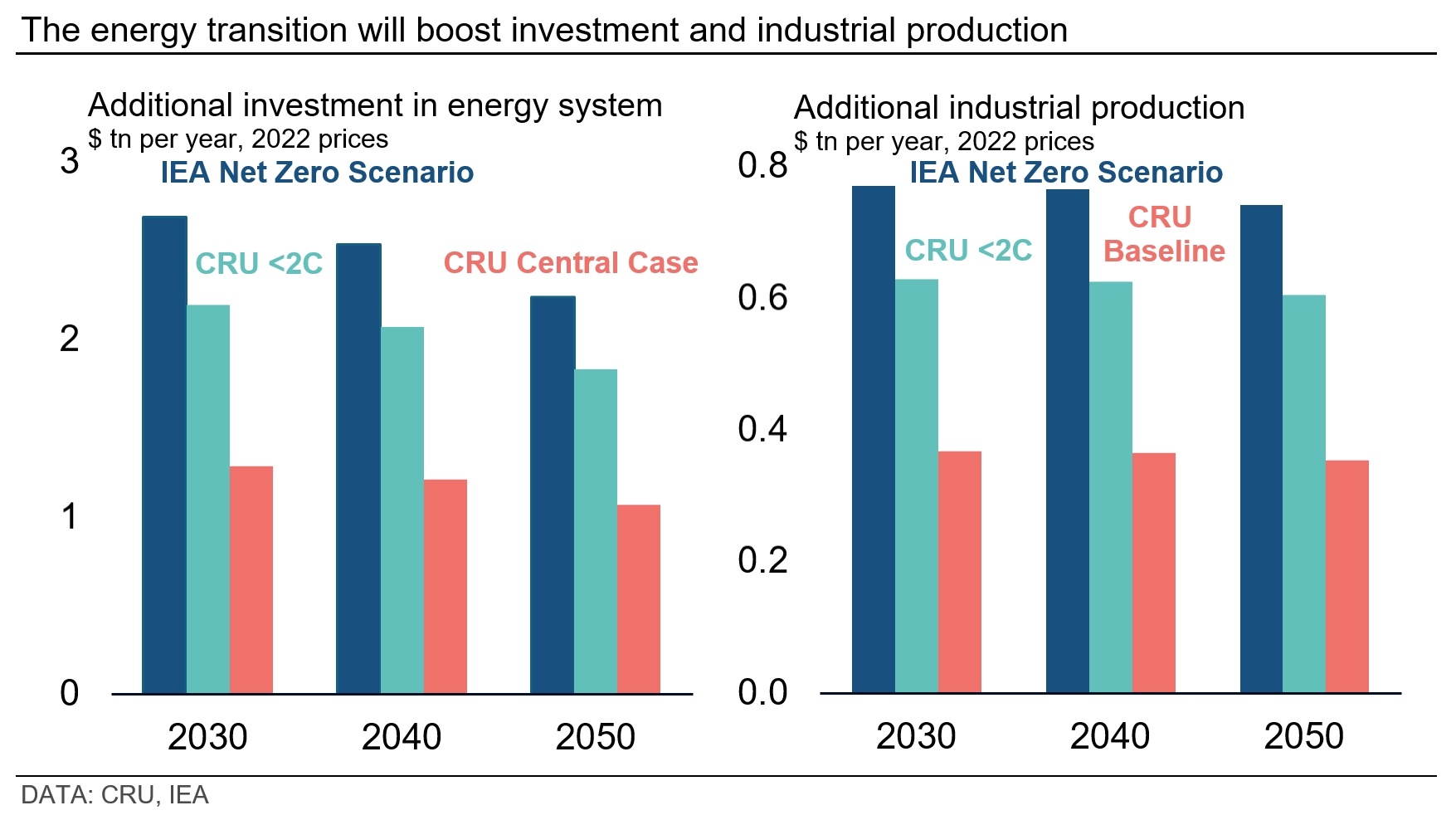 The IEA’s NZE scenario sets out a highly aggressive path for decarbonisation that would limit temperature increases to +1.5°C above pre-industrial levels. We do not think this is the most probable path for decarbonisation. However, even in our own <2.0°C and Central Case scenarios for emissions, the additional investment required will be substantial. Some of this spending will crowd out investment in other sectors, as discussed below. Still, some will crowd out consumption (public or private).