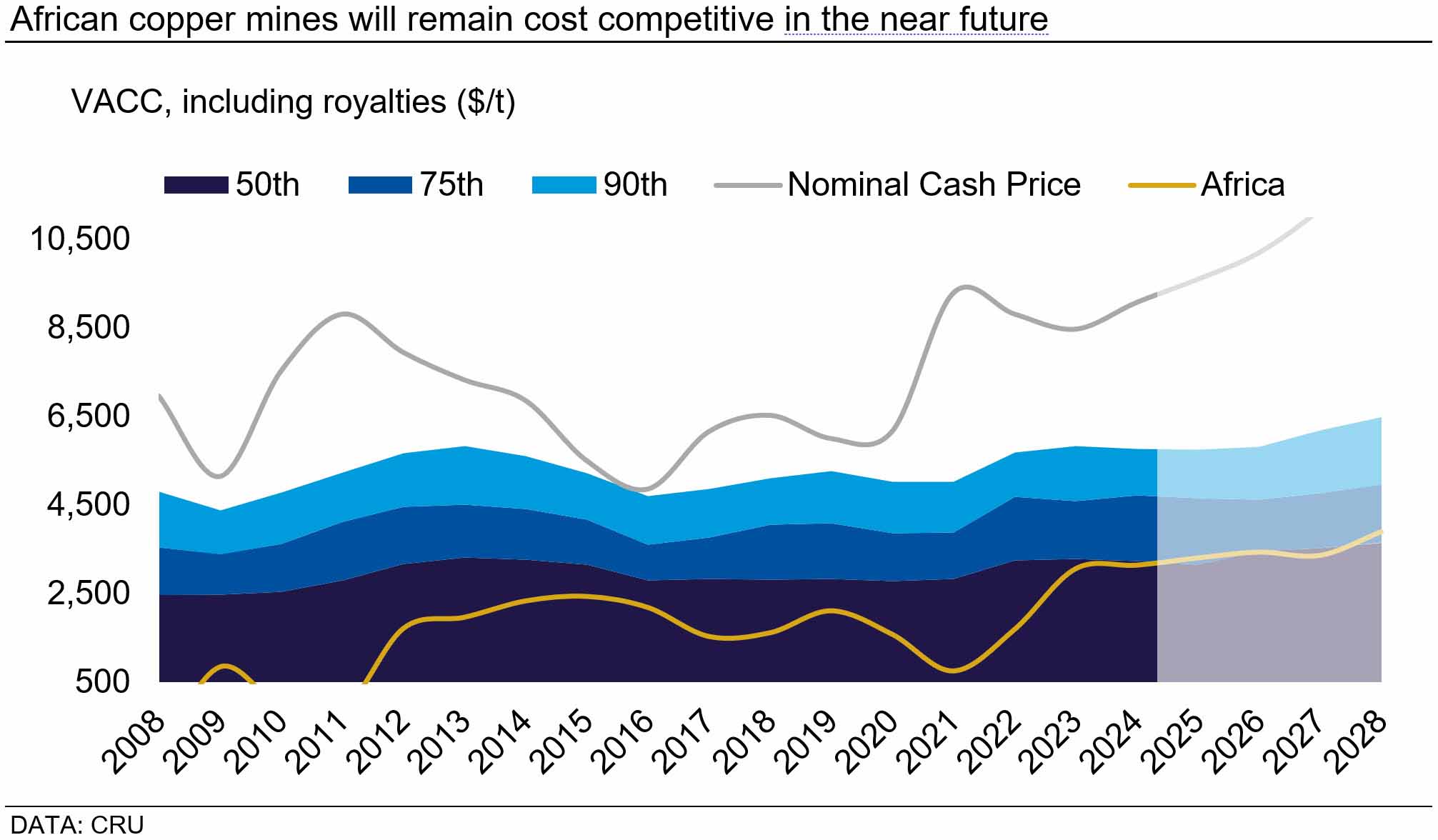 From a cost perspective, African copper mining compares favourably to other regions. In terms of both site costs and value-adjusted cash costs, including royalties (VACC), Africa falls just above the world average – with site costs at $4,731/t and a VACC of $3,067/t. Currently, this positions Africa as the third-lowest region in terms of site costs, behind Central and South America, and Asia (excluding China). In contrast, 14 years ago, Africa had the highest site costs among all global regions.