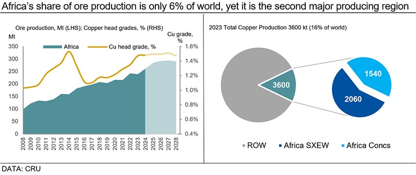 Although Africa accounts for only 6% of the world's copper ore production, it stood as the third largest producing region in 2023, with 16% of the world’s mined copper units. This is primarily due to the high-grade nature of the central African Copperbelt – the source of over 90% of Africa's copper.