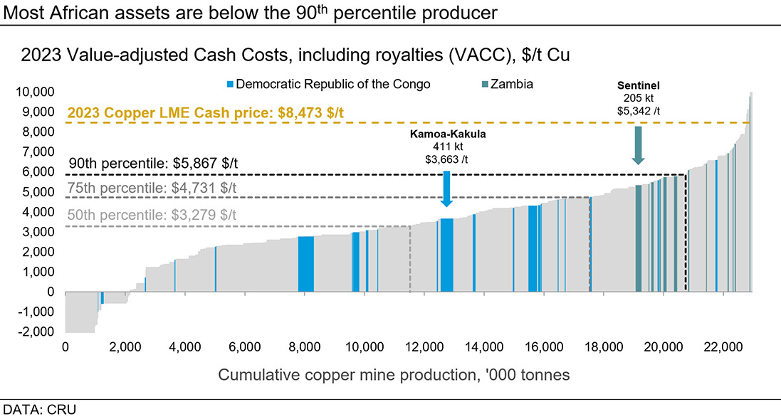 Although, on average, African copper assets have a favorable VACC, a closer examination of individual assets unveils a nuanced distribution. The largest producing assets, with notably low VACC (hovering around the second quartile), are situated in the DRC. These specific assets benefit from favorable by-products, such as cobalt, which despite cobalt’s diminishing fortunes, significantly reduces overall costs.