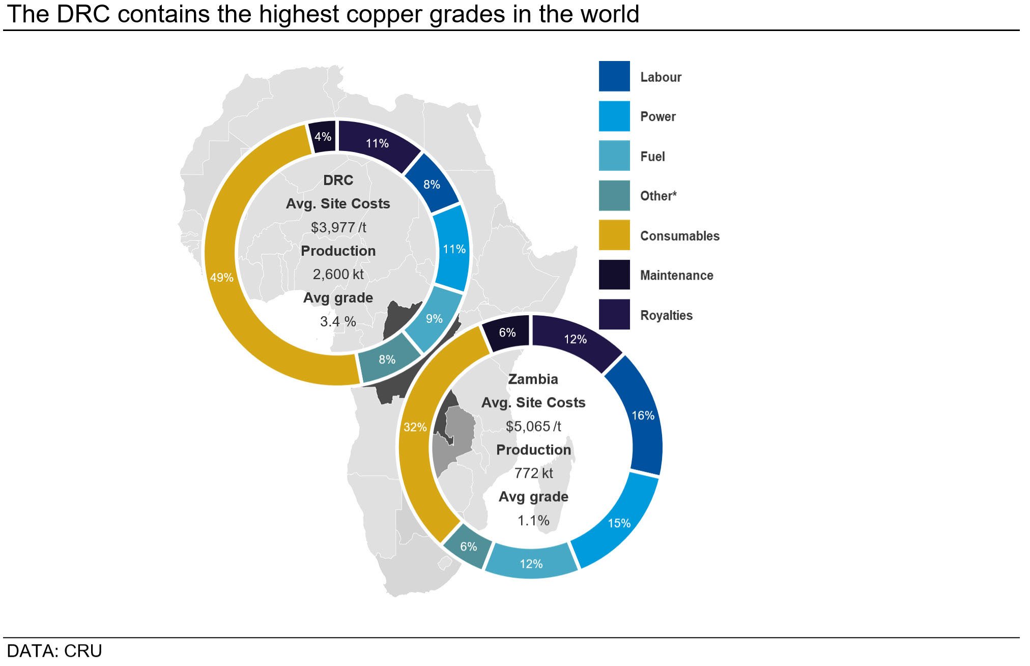 The difference in site costs can be mostly attributed to the significant grade difference between the two regions. The DRC is the highest-grade copper producing country globally, with a weighted average head grade of 3.4%, compared to Zambia’s 1.1%. In simplified terms, a ‘typical’ Zambian mine must process three times more ore than its northern neighbour to produce one unit of copper. Despite this, Zambia’s average head grade is still favourable compared to the world average of 0.58% and thus still contains competitive site costs compared to other countries.