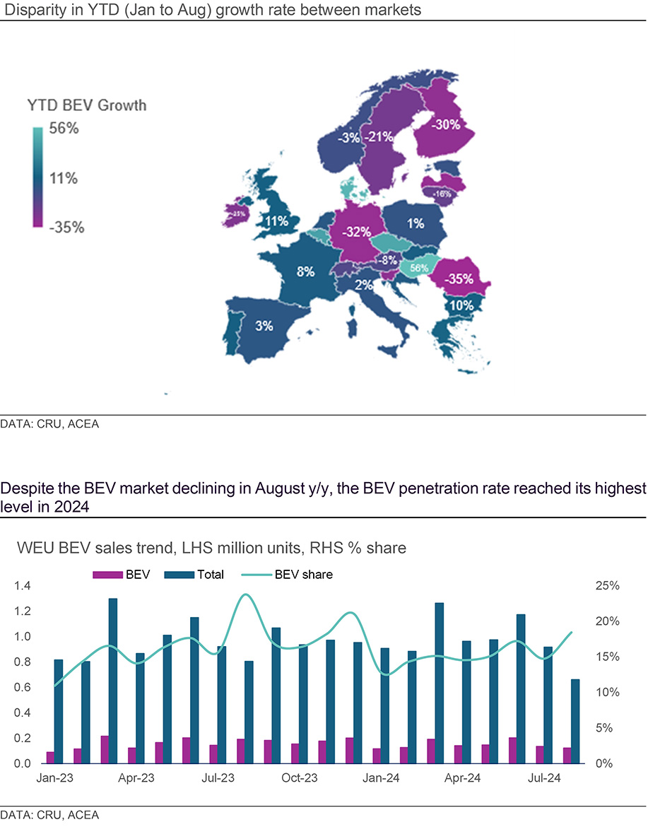 Europe: German auto production increased in August y/y supported by robust export demand. However, YTD output remains down over the first eight months of the year, impacted by various external and industry factors, including a drop in demand for BEVs. In Germany, Europe’s largest BEV market, BEV demand fell 68.8% y/y in August, though distorted somewhat by base effects. However, with this weaker data, we have again downgraded our BEV forecast for Germany and EU.