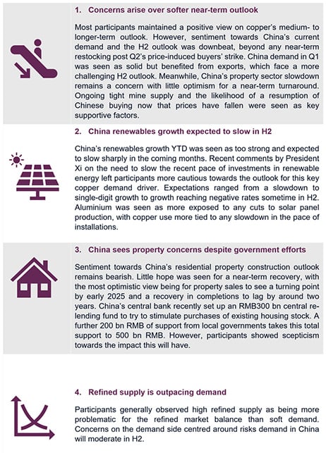CRU attended LME Asia Week in Hong Kong over 24–28 June, meeting with market participants from across the sector. Overall, sentiment towards current demand and the near-term outlook was downbeat. Concerns centred around refined supply outpacing demand and risks to the outlook for Chinese demand over the balance of this year.