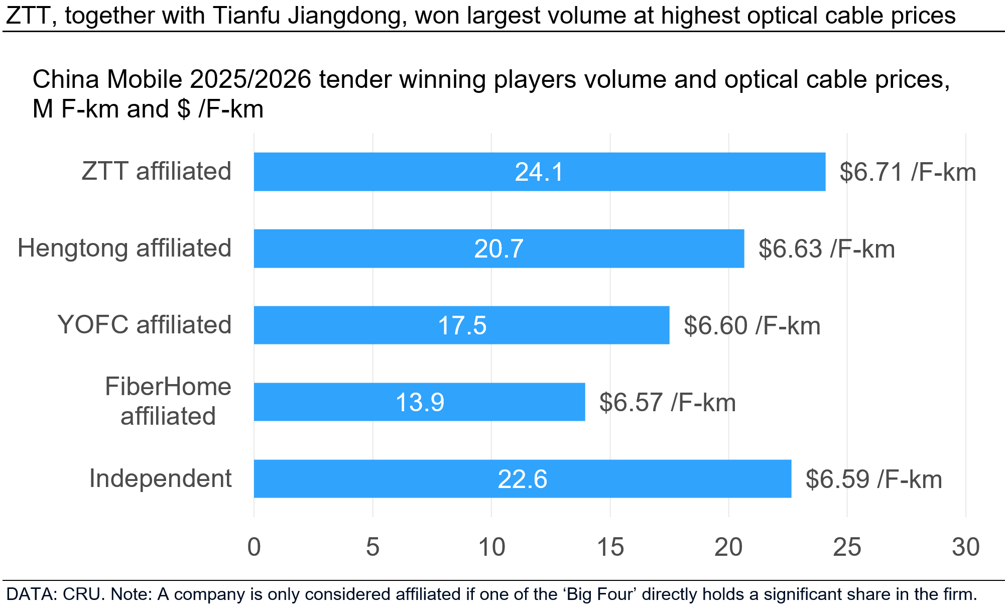 In terms of pricing, the weighted average price in this China Mobile optical cable tender settled at RMB53.85 /F-km, including VAT (or $6.63 /F-km excluding VAT) – representing a decline of 26.2%, compared to the previous tender. As discussed in CRU’s China Mobile 2025/2026 tender announcement insight, this sharp price drop reflects broader market dynamics – notably reduced domestic consumption amid persistent oversupply in recent years.