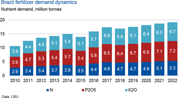 Over the past two decades, Brazil has emerged as an agricultural powerhouse due its ample availability of arable land and suitable climatic conditions. Brazil is the world’s largest producer of sugar and the second largest producer of soybeans. The growth in agricultural production has led to a sharp rise in fertilizer demand.