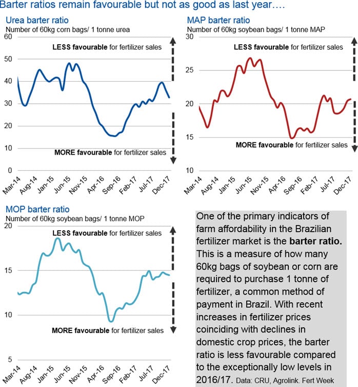 Fertilizer demand growth in 2018 is unlikely to be repeated after such a strong step change in 2017 consumption. Lower crop prices are starting to apply downward pressure on margins after record production levels during in 2016/17. Low corn prices are the main driver of the anticipated fall in Safrinha corn area and farmers are expected to shift to crops such as cotton or leave land to fallow.