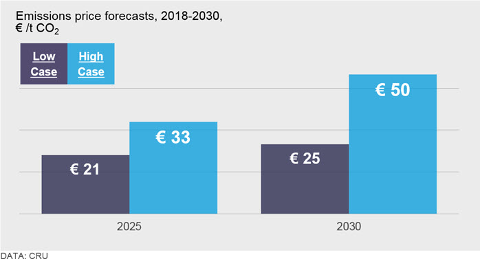 Further reforms are expected as part of Phase IV of the scheme with effect from 2021 (including a significantly tighter emissions cap). CRU’s analysis suggests that prices in the region of €20–50 /tCO2 are likely to be observed between 2021–2030 (depending on market and policy conditions).
