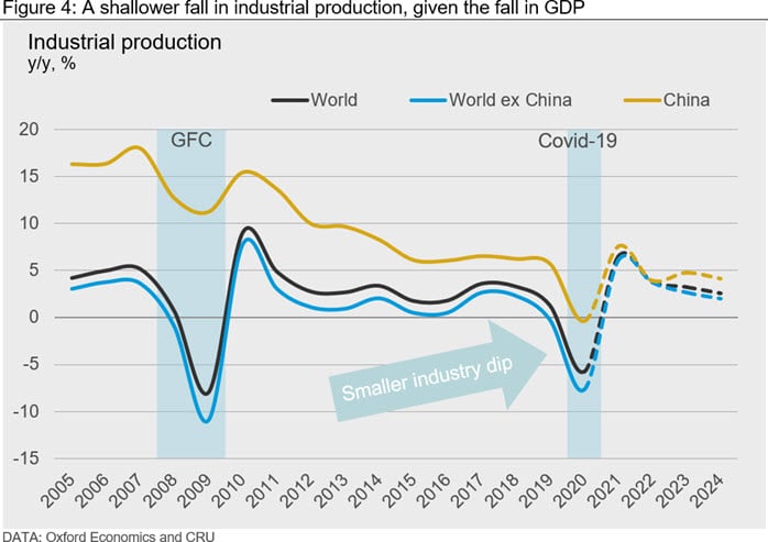 Covid is different. Our view is that the Covid-19 downturn will give rise to a fall in world IP that is roughly equal to the fall in world GDP, ~5% in 2020 (Figure 4). The smaller than usual fall in IP arises because the pandemic hurts services by more than it hurts industry.