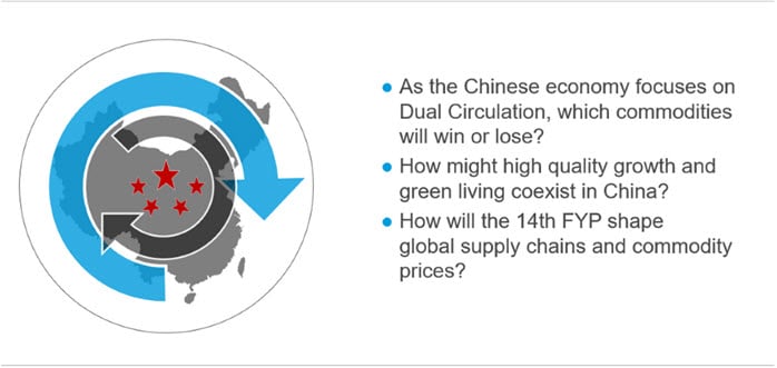 2021 marks the launch of China’s 14th five-year plan (FYP). It will provide a roadmap through to 2025 and beyond. Markets will gain greater clarity about China’s Dual Circulation strategy. CRU will consider the emphasis the new FYP puts on internal circulation and domestic consumption as the main pillar of economic growth, as well as consider the pace at which China may pivot away from infrastructure investment and trade. We will look at how the country’s new growth and development targets feed through to metal end-use demand and commodity demand, and consider the commodity winners and losers.
