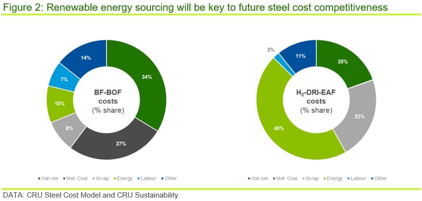 Figure 2 illustrates the typical cost structure of a BF-BOF steel plant and projected costs for a green hydrogen-based direct reduced iron-electric arc furnace (H2-DRI-EAF) in 2030. We have chosen to model H2DRIEAF costs as the proxy for green steel costs because we expect this to be the most developed low carbon technology by 2030 based on the current project pipeline.