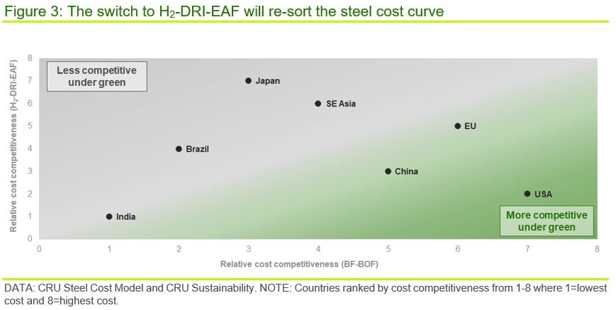 To test the impact of green technologies on regional global steel cost trends, CRU has undertaken research into renewable electricity cost trends and used this to derive costs for a theoretical H2-DRI-EAF plant in each of the major steelmaking regions in 2030. The results are shown in Figure 3 below. The x-axis indicates the relative cost position of each region under conventional BF-BOF technology, while the y-axis indicates the relative cost position under H2-DRI-EAF technology. Regions in the bottom right-hand quadrant have an improved cost position under the H2-DRI-EAF process (i.e. have moved from a high cost to low cost position). Regions in the top left-hand quadrant of the chart have a reduced competitiveness under H2-DRI-EAF technology.