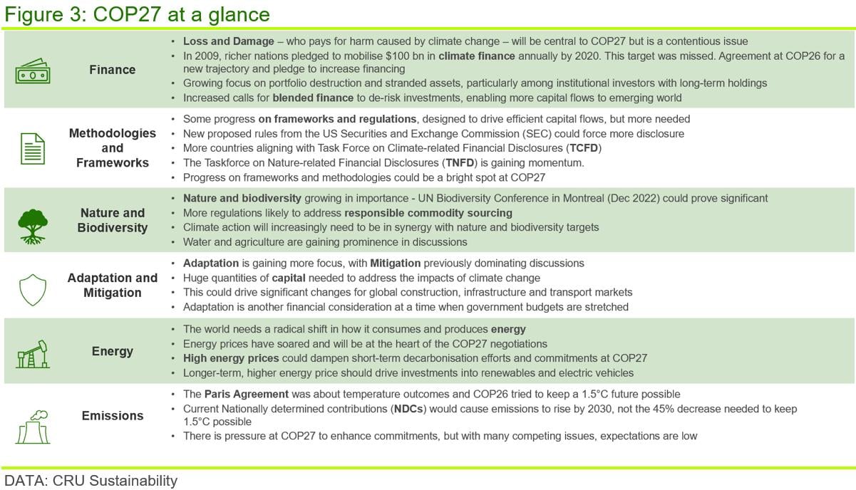 Governments may temper their policies due to these short-term issues, but they may agree to do more later. The risks of such backloading of action mean that the longer that action is delayed the costlier it could be, and more problems will be created for a later date. Having said this, there has also been an increased focus on implementation within long-term EU energy policies and the US Inflation Reduction Act. COP27 could be considered a success if climate ambition is accelerated and there is greater focus on implementation, supported by the release of a more concrete action plan. Figure 3 below shows the key areas that will be considered at COP27.
