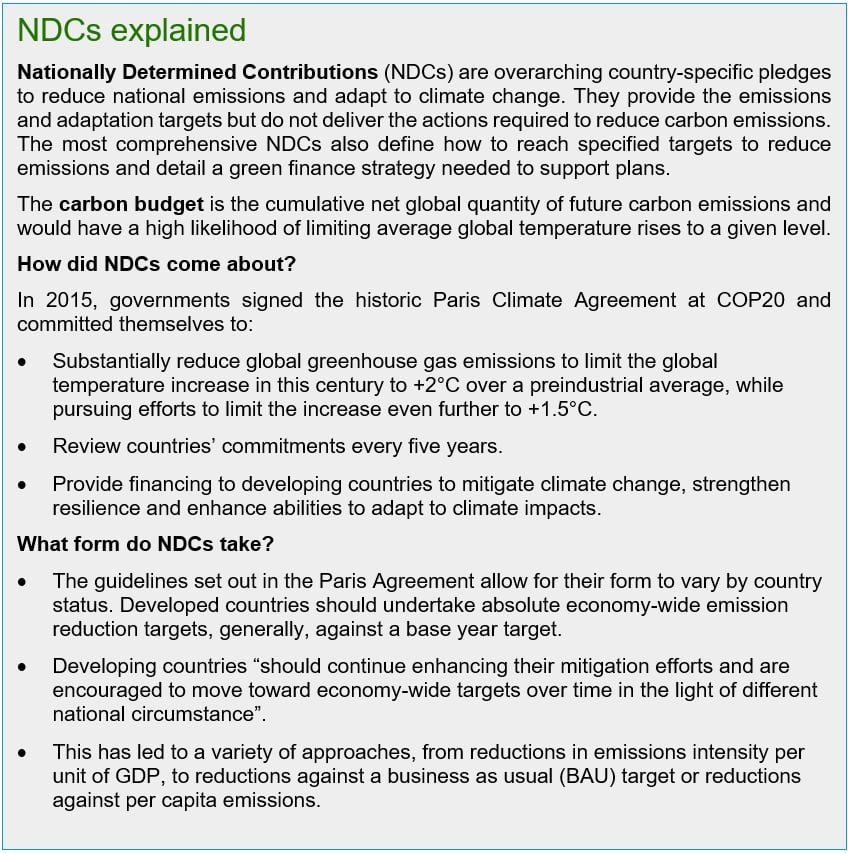 Nationally Determined Contributions (NDCs) are a much discussed but often misunderstood part of climate policy. Simply, NDCs are overarching country-specific pledges to reduce national emissions and adapt to climate change. They provide broad targets towards decarbonisation. However, on their own they will not deliver the actions needed.