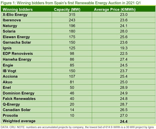 If Spain’s attempt to decouple electricity prices from fossil fuel prices is deemed to be successful, this could jeopardise the long-term profitability of the winning projects if that leads to policy change. If perceived to be realistic, such potential policy changes could result in the abandonment of projects before they are built, given the deadline for commissioning is 2024.